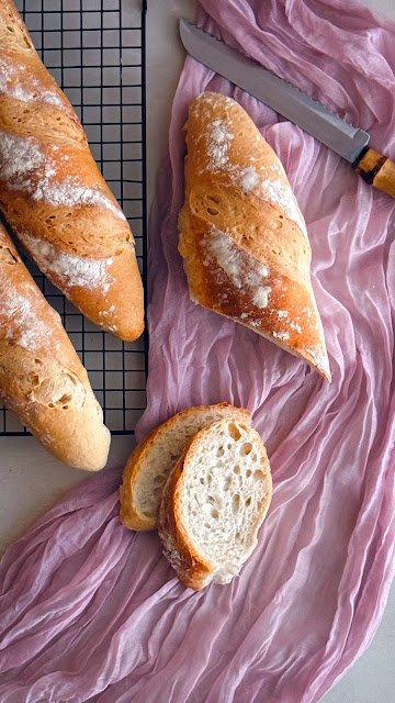 A casca dessas baguetes fica crocante e deliciosa, o miolo fica aerado e super macio.